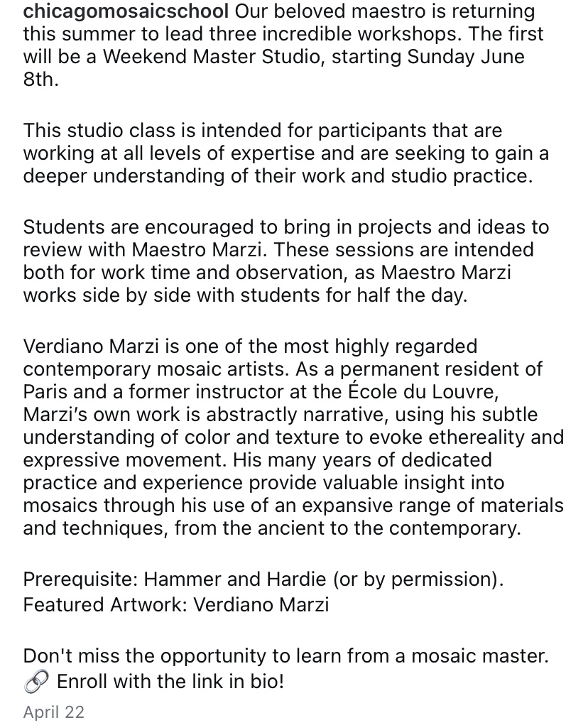 Promotional content example, highlighting an International Visiting Artist mosaic workshop.